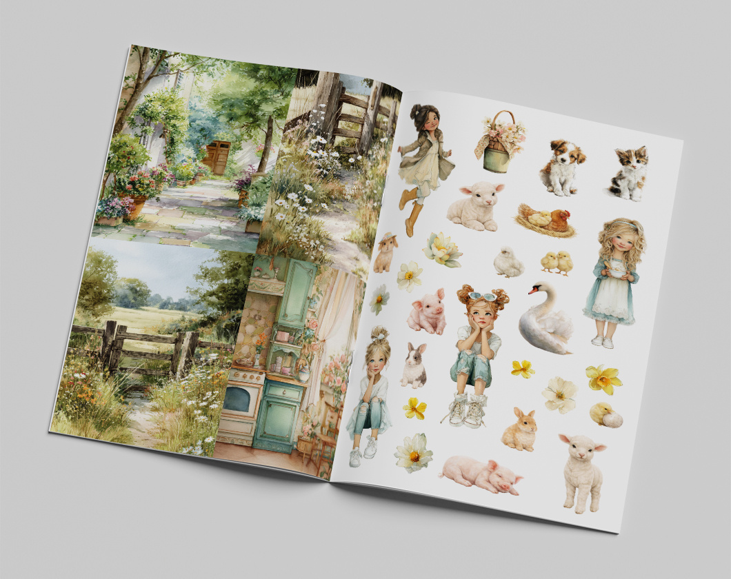 Dieses Buch enthält zahlreiche Hintergründe, Accessoires, Figuren und Beschriftungstexte, die sich perfekt für die Durchschläge der Reihe „In voller Blüte“ eignen. Es ist auch ideal für die Verwendung mit anderen Durchschlägen oder den Illustrationen aus